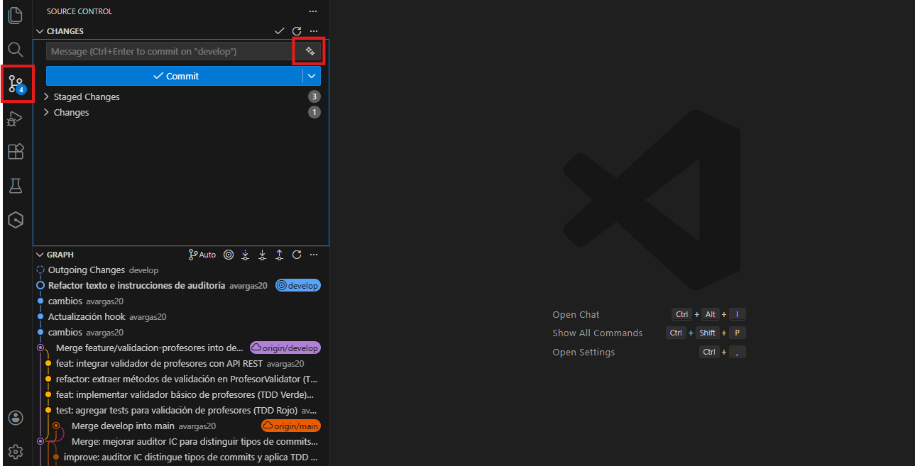 - Ubicar el cursor en el campo del mensaje de commit y utilizar GitHub Copilot.